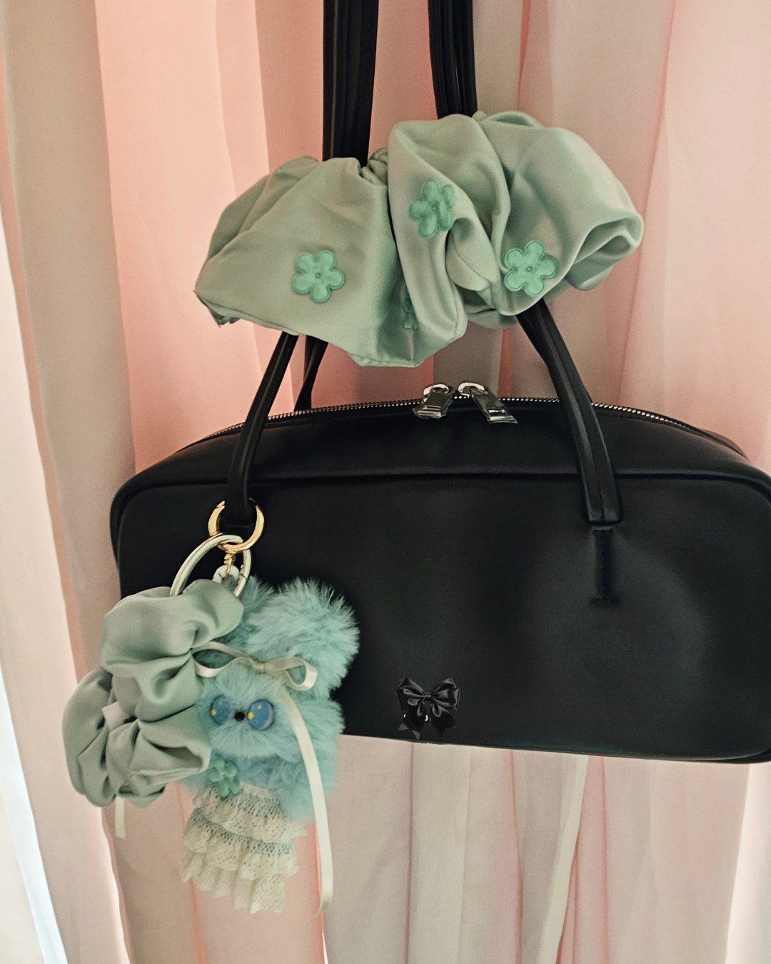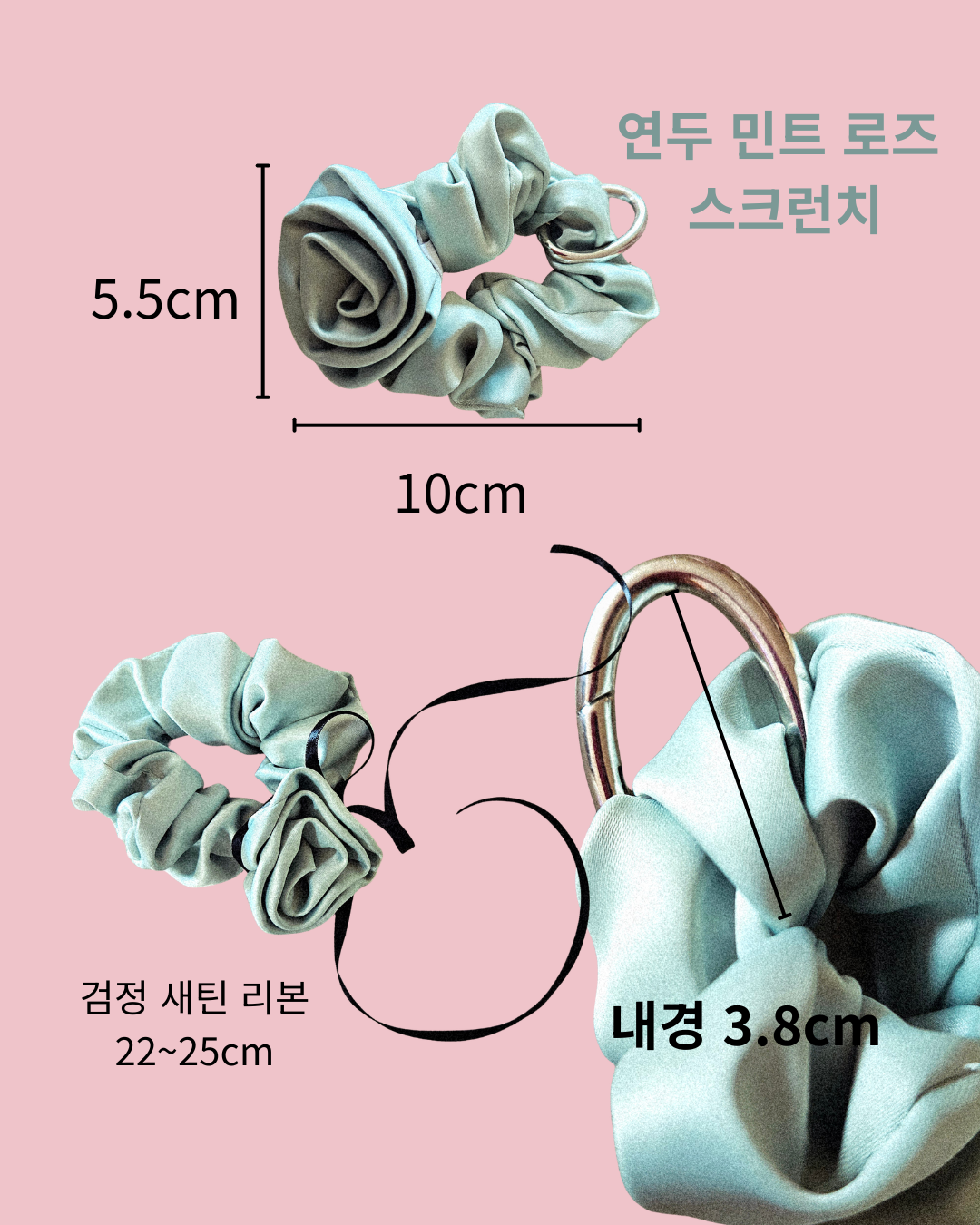민트 로즈 스크런치 & 백참체인(10cm): 고밀도 매끈한 새틴의 은은한 광택의 라이트 연두빛 민트 컬러. 백참용 오벌 원터치 체인이 포함되어 가방에도 세련되게 매치됩니다.