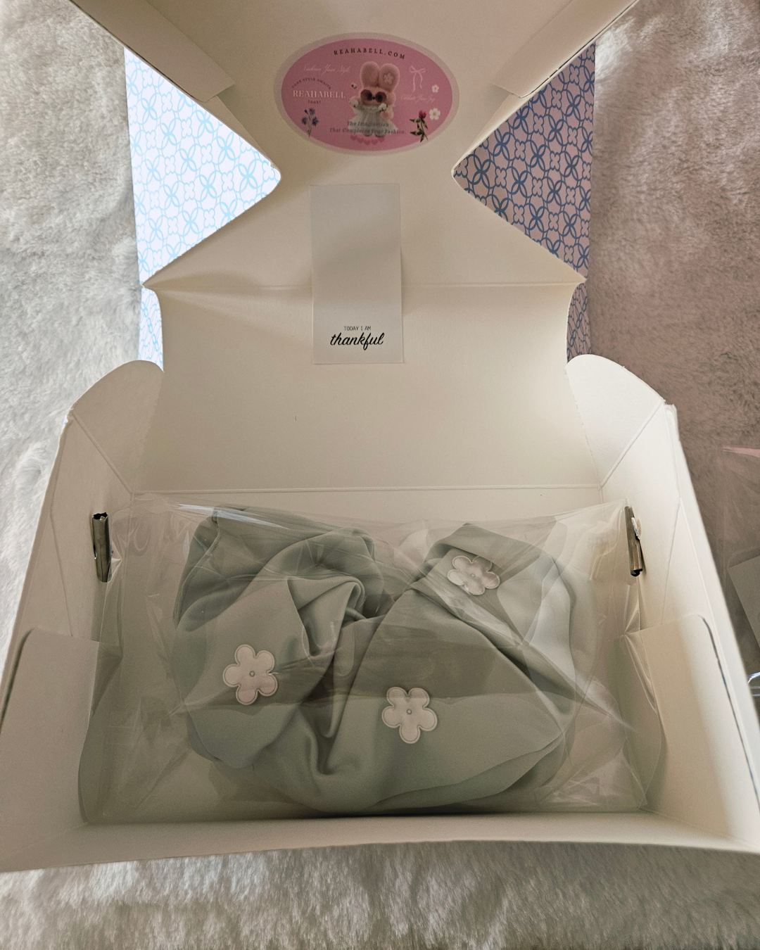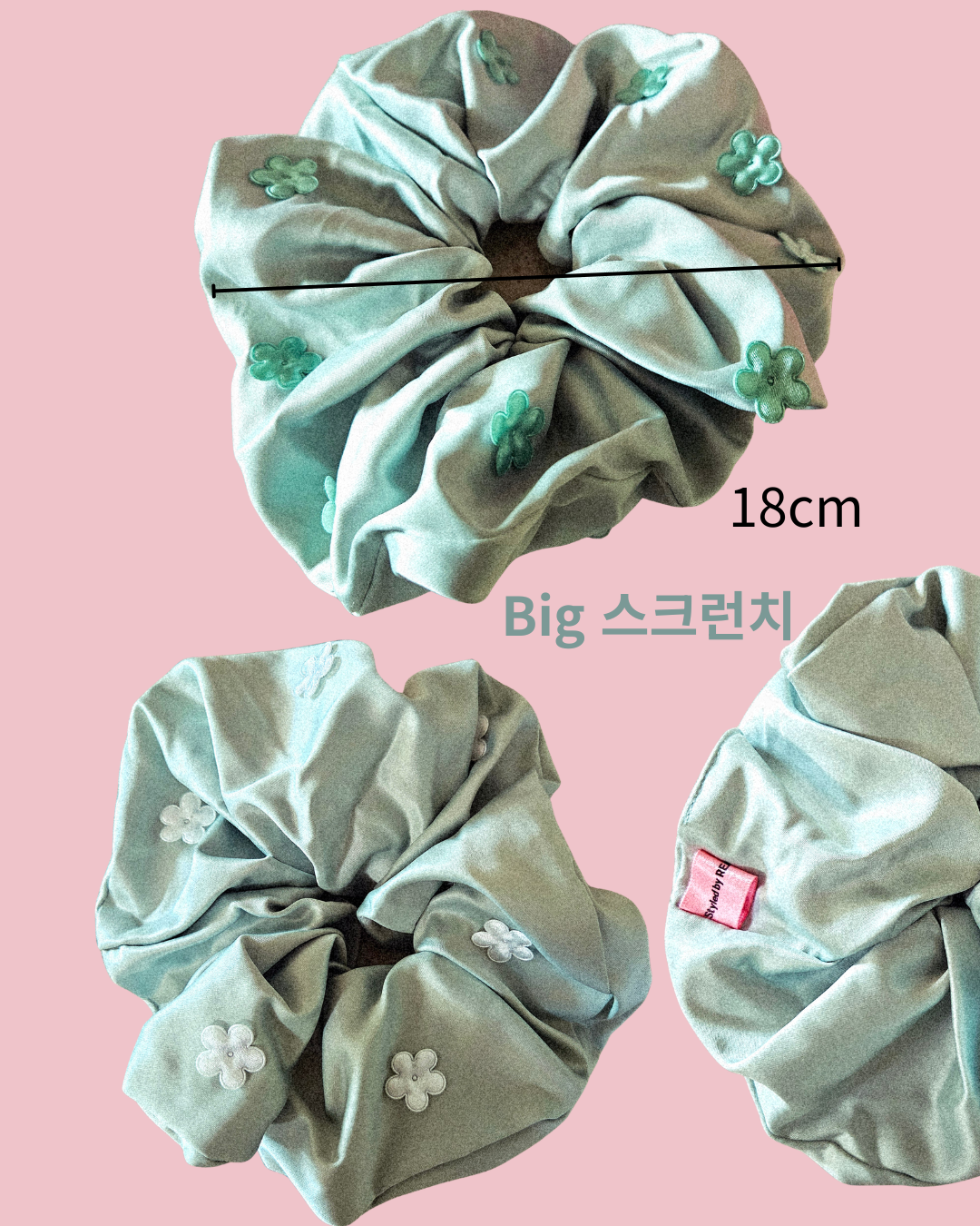 Big 데이지 스크런치(18cm): 래하벨의 시그니처 데이지가 포인트! (화이트/연두 민트 데이지 꽃 중 선택) 머리를 묶는 것 외에도 가방 끈 정리도 러블리하게 OK
