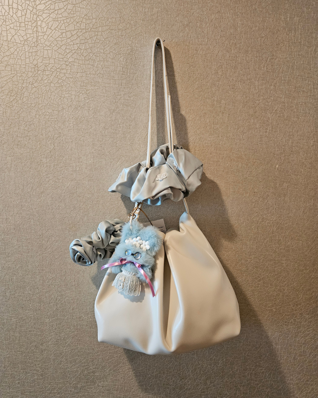 2)사진처럼 빅 스크런치는 머리를 묶지 않을 때는 가방 끈에 달아서 매번 좌우 움직이는 가방끈을 순식간에 정리할 수 있습니다.